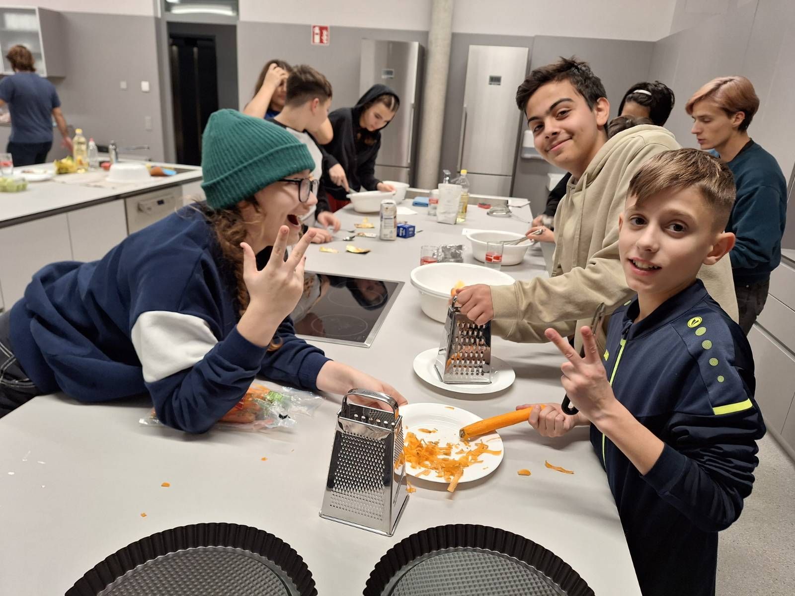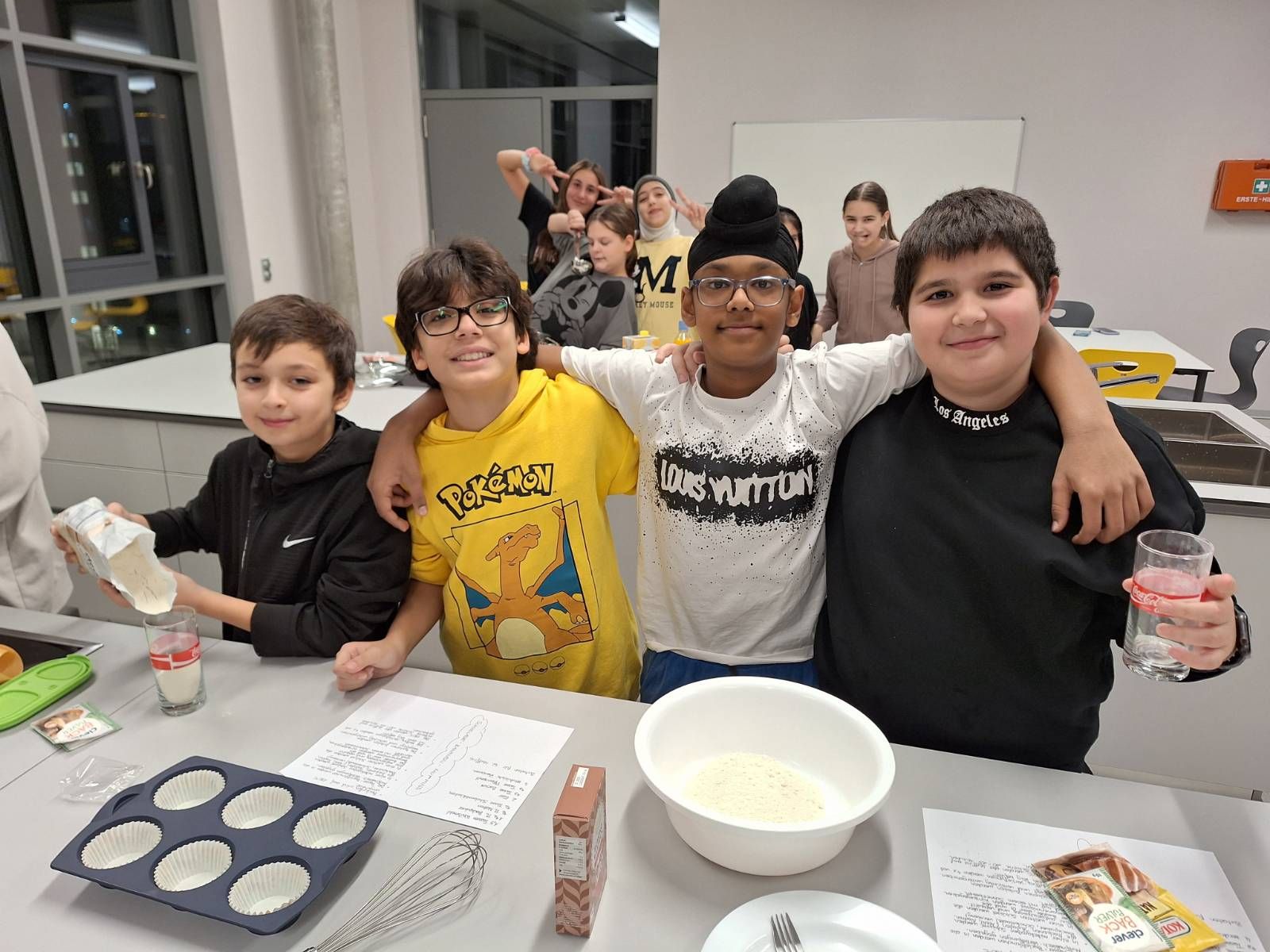 Die 2B hat sich am Abend für die Übernachtung mit Kebab gestärkt. Danach haben wir das erste Mal in der Schule gebacken. Den Abend haben wir mit Fernsehen am Smartboard ausklingen lassen. Zum Frühstück waren wir wieder fleißig und haben Waffeln und Muffins gebacken.