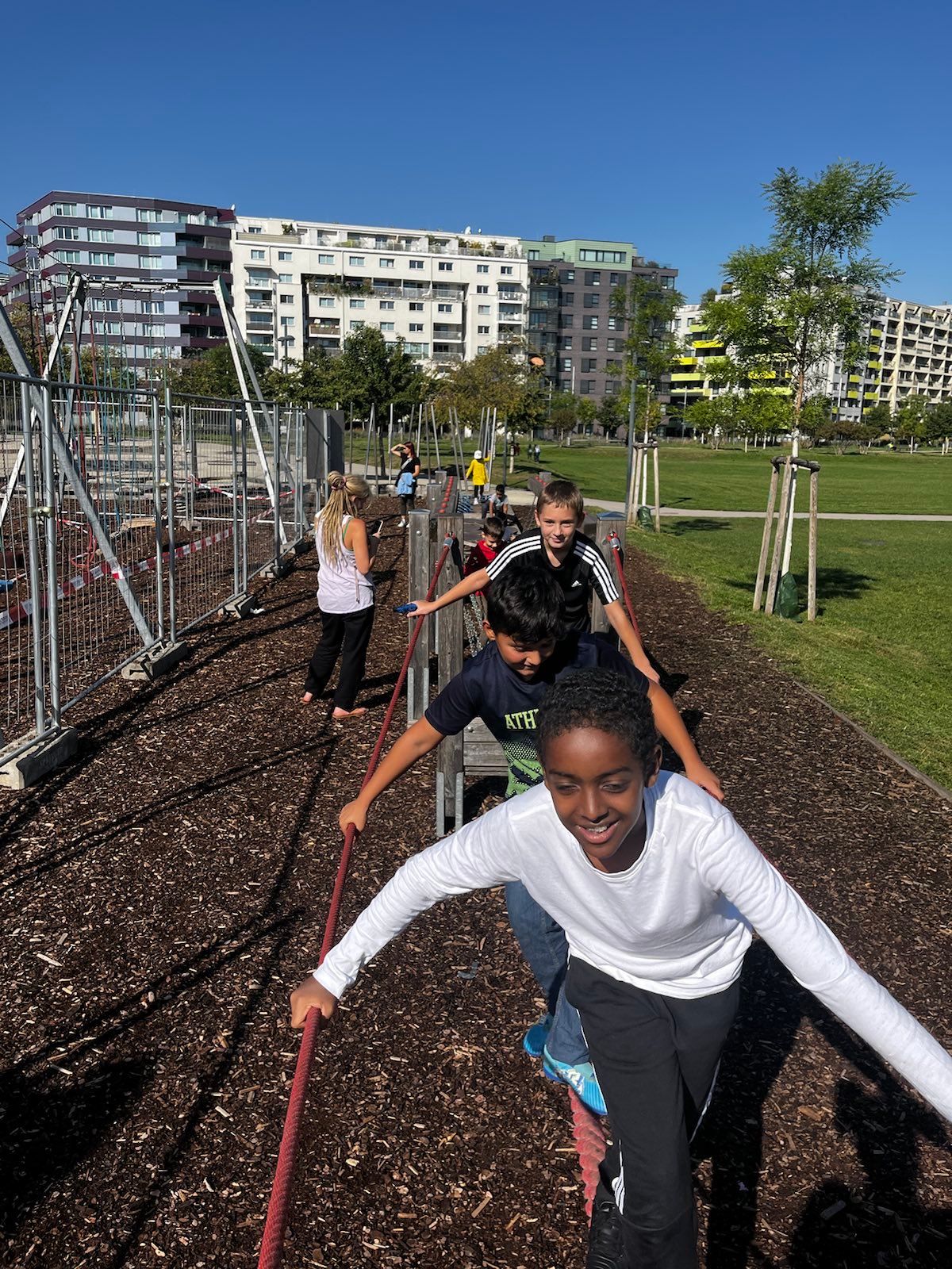 In der ersten Schulwoche ging es für unsere 1A bei strahlendem Sonnenschein auf einen Ausflug, bei dem die Schülerinnen und Schüler die Gelegenheit hatten, sich untereinander besser kennenzulernen und Zeit miteinander zu verbringen. Der erste Stopp führte uns zu einem großen Sportplatz mit angrenzendem Hindernisparcours, bei dem die 1A ihre Geschicklichkeit unter Beweis stellte. Das Highlight für viele Kinder war bestimmt das kleine Fußballmatch, bei dem Frau Bahdi und Herr Kuzmits ebenfalls teilnahmen. Kurz ausgeruht im Schatten ging es dann weiter zur Wasserwiese, die mit zahlreichen Spielmöglichkeiten und einem Brunnen ausgestattet war, der den Kindern bei den hohen Temperaturen sichtlich Freude bereitet hat. Nach dem Aufenthalt auf der Wasserwiese mussten wir uns dann wieder auf den Weg zurück zur Schule machen. Der Ausflug war wirklich sehr nett und wir freuen uns schon auf viele weitere!