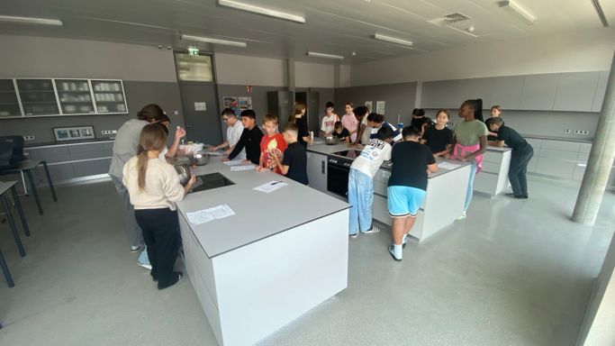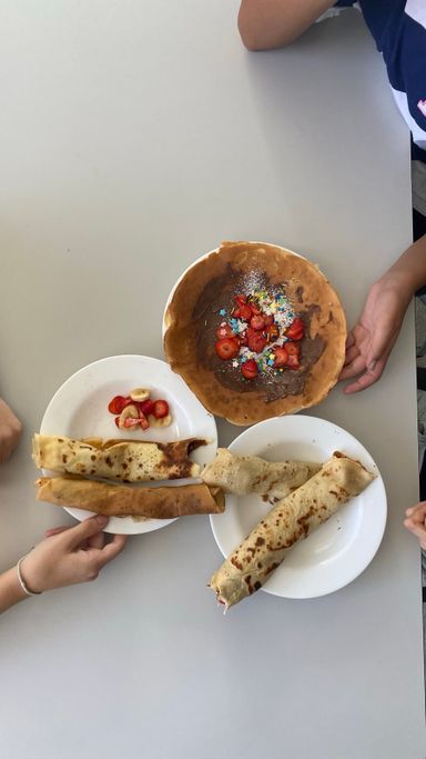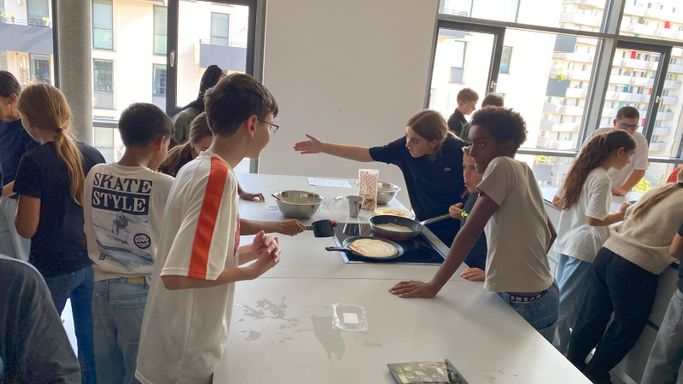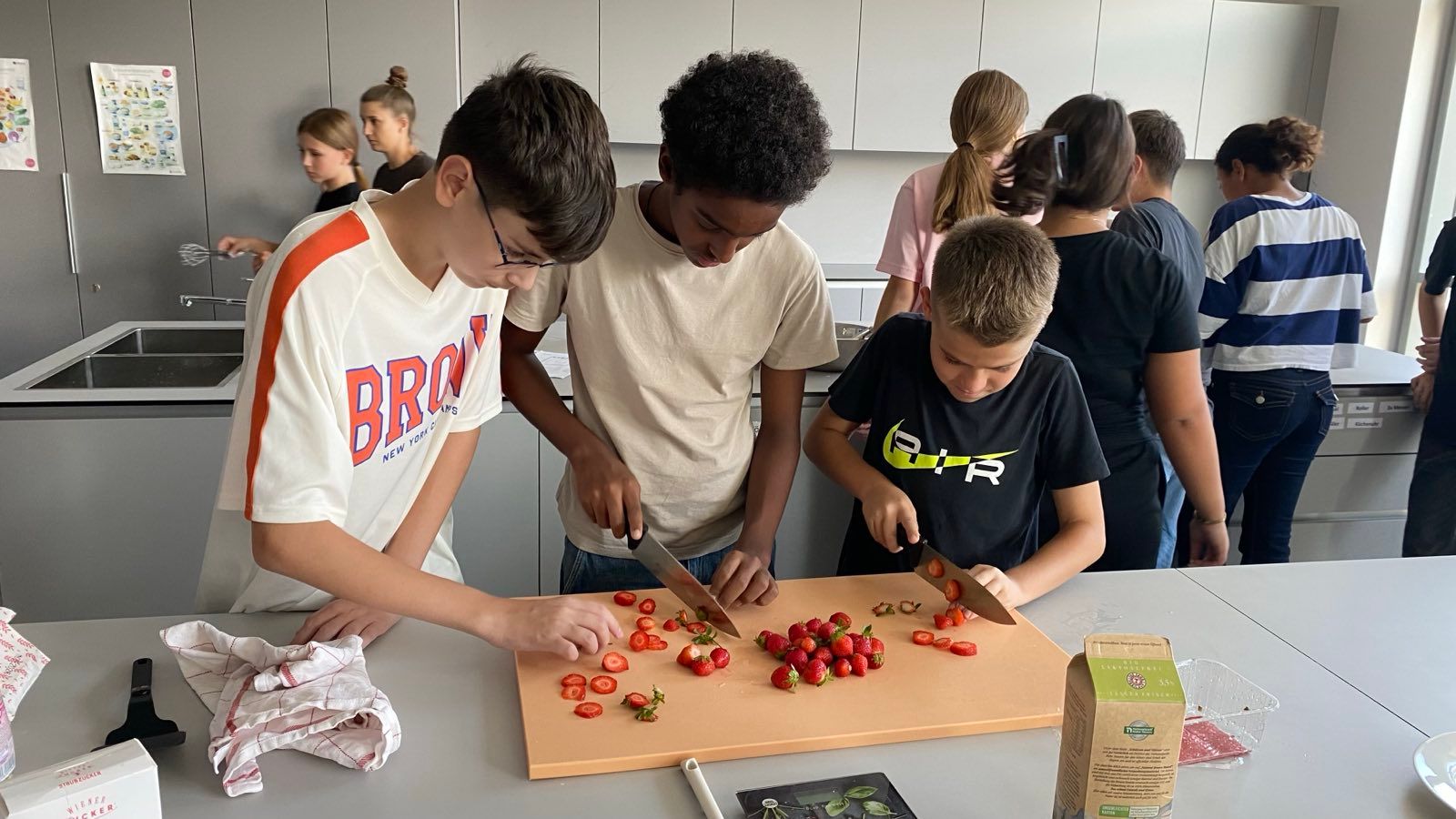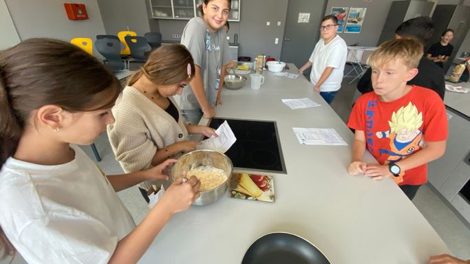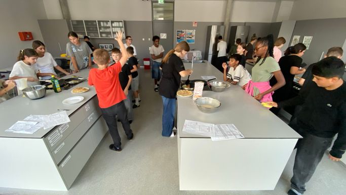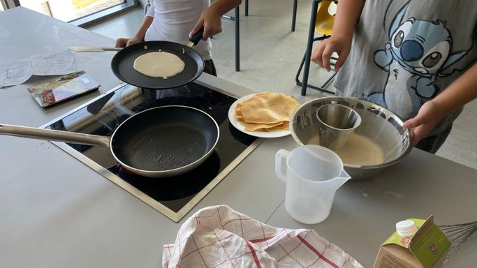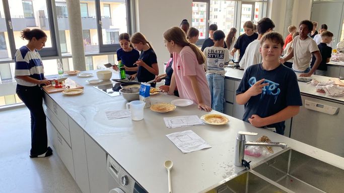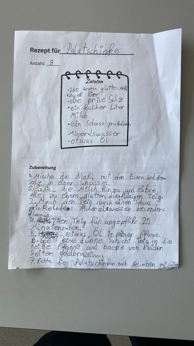 Nachdem die 3A ihr Wissen über die sprachlichen und mathematischen Aspekte von Rezepten aufgefrischt hatte, ging es in die Schulküche, wo die zuvor erarbeiteten Rezepte für Palatschinken gleich erprobt werden konnten. Begleitet wurde die Klasse von Viktoria Bramberger und Bernav Demir.